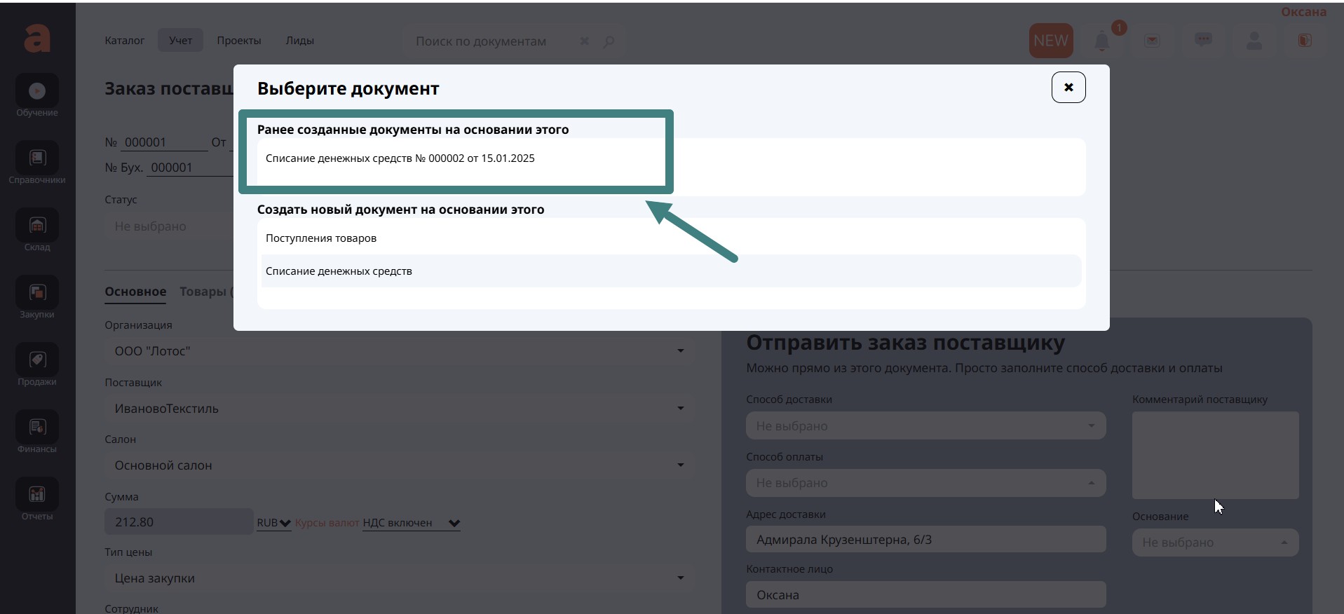 Документ оплаты поставщику Списание денежных средств можно посмотреть в Заказе поставщику открыв кнопку Создать на основании.
