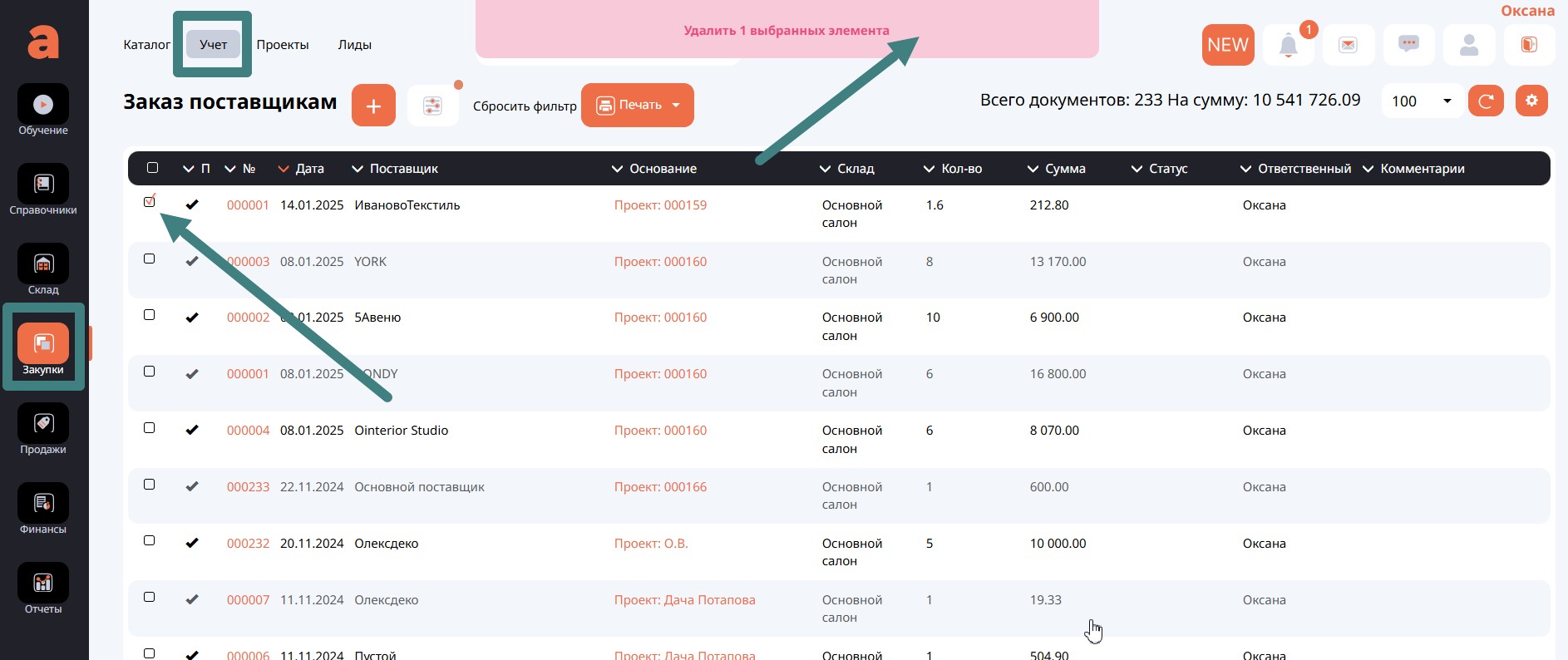Поступление товара можно удалить не выходя из Проекта, отметив его галочкой и нажав кнопку Удалить _ выбранных элементов