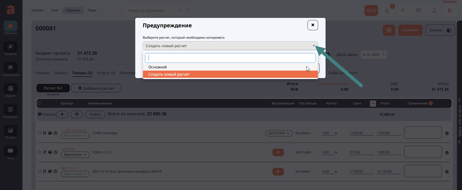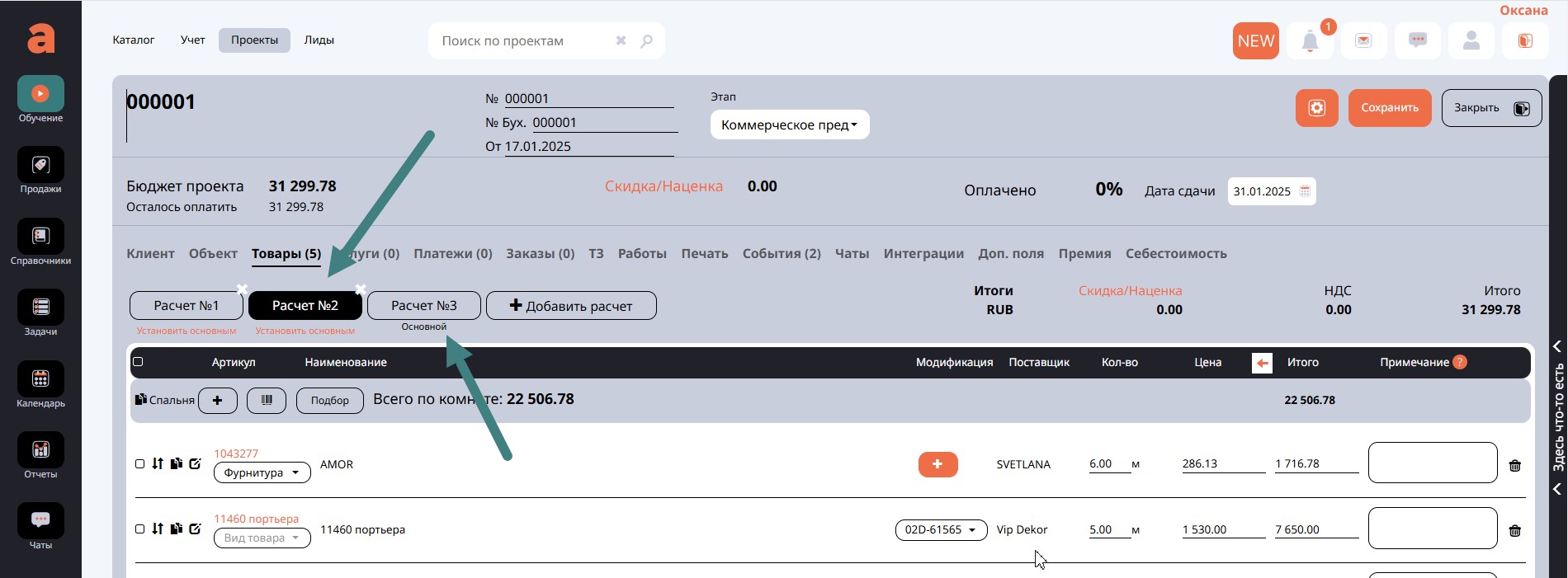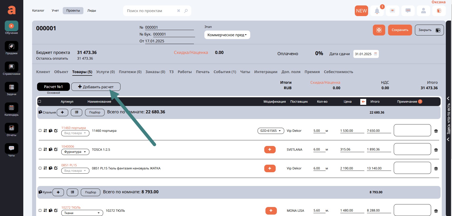 Если первоначальный расчет и подбор товаров и услуг не устроил вашего клиента, программа позволяет добавить в проект еще один или несколько вариантов расчета. Сделать это можно кнопкой Добавить расчет.