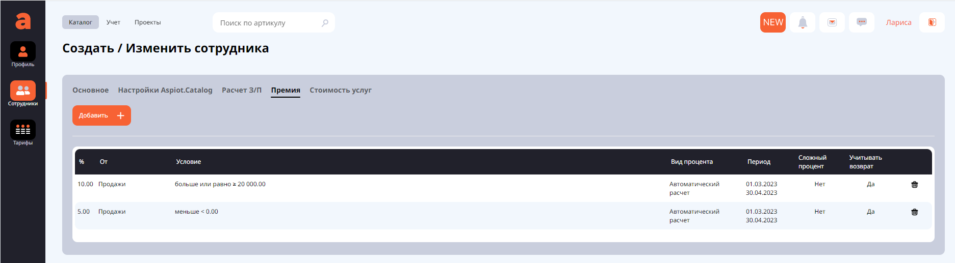 Заходим в карточку сотрудника и переходим на вкладку премия, нажимаем на кнопку + Добавить. Открывается окно настроек.