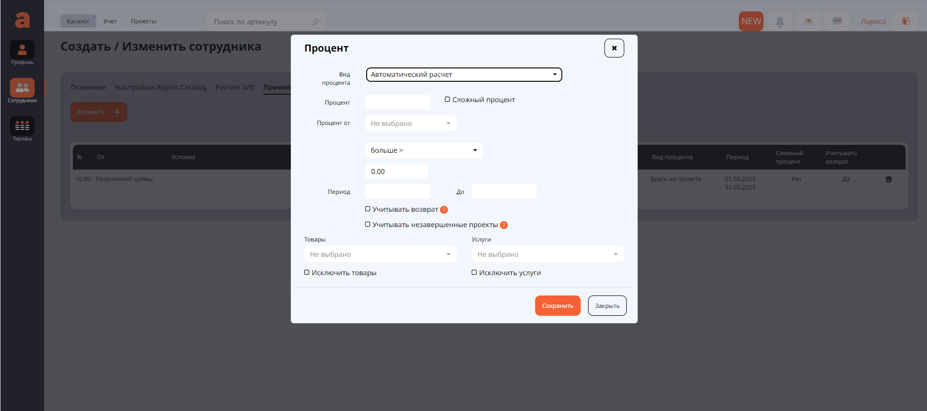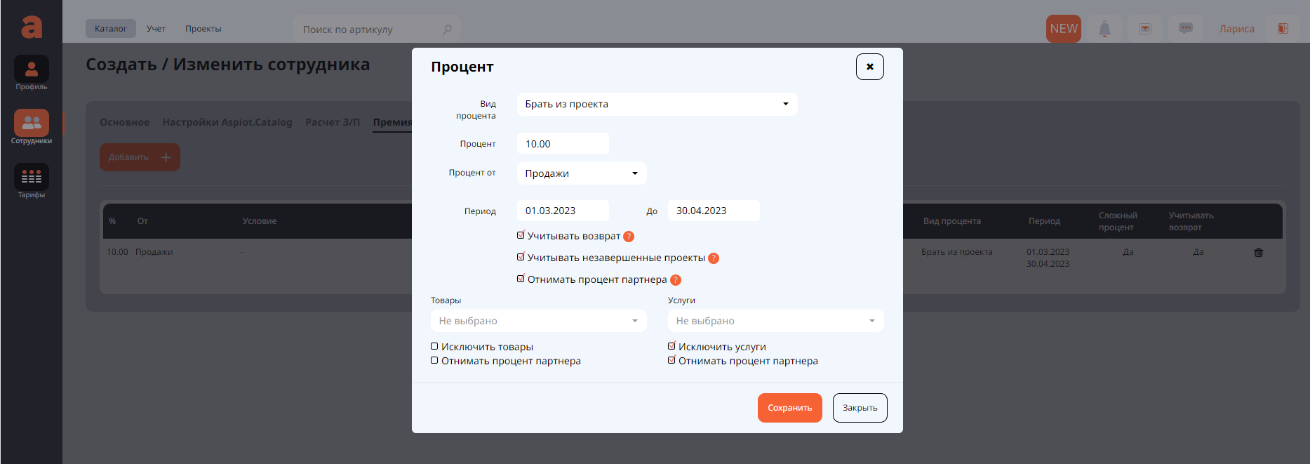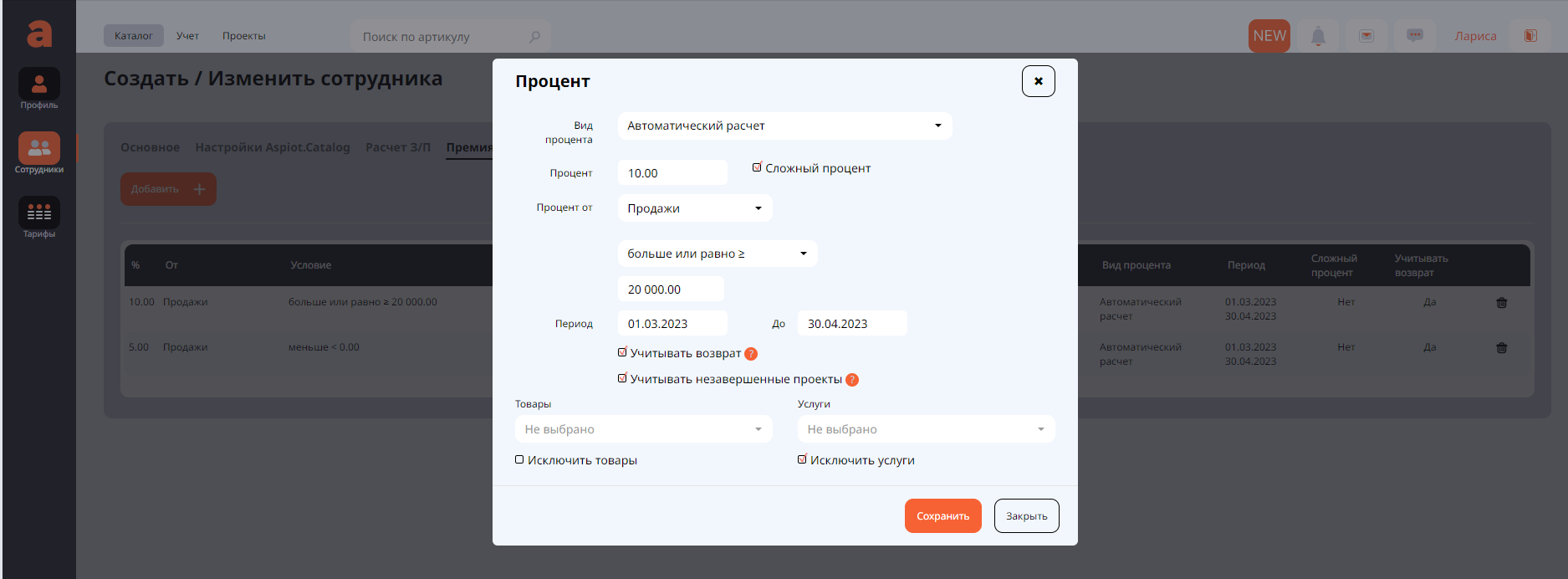Возможно определить товары и услуги, от продажи которых будет рассчитываться премия. Если вы хотите исключить из расчета определенные товары и услуги, вы должны установить галочку Исключить под выбранными товарами или услугами.