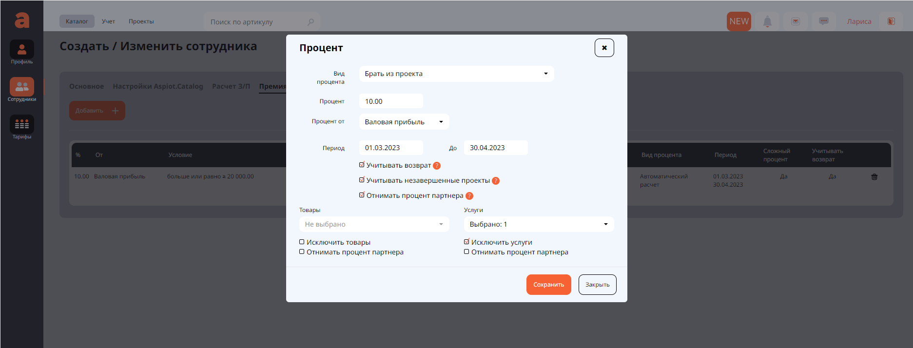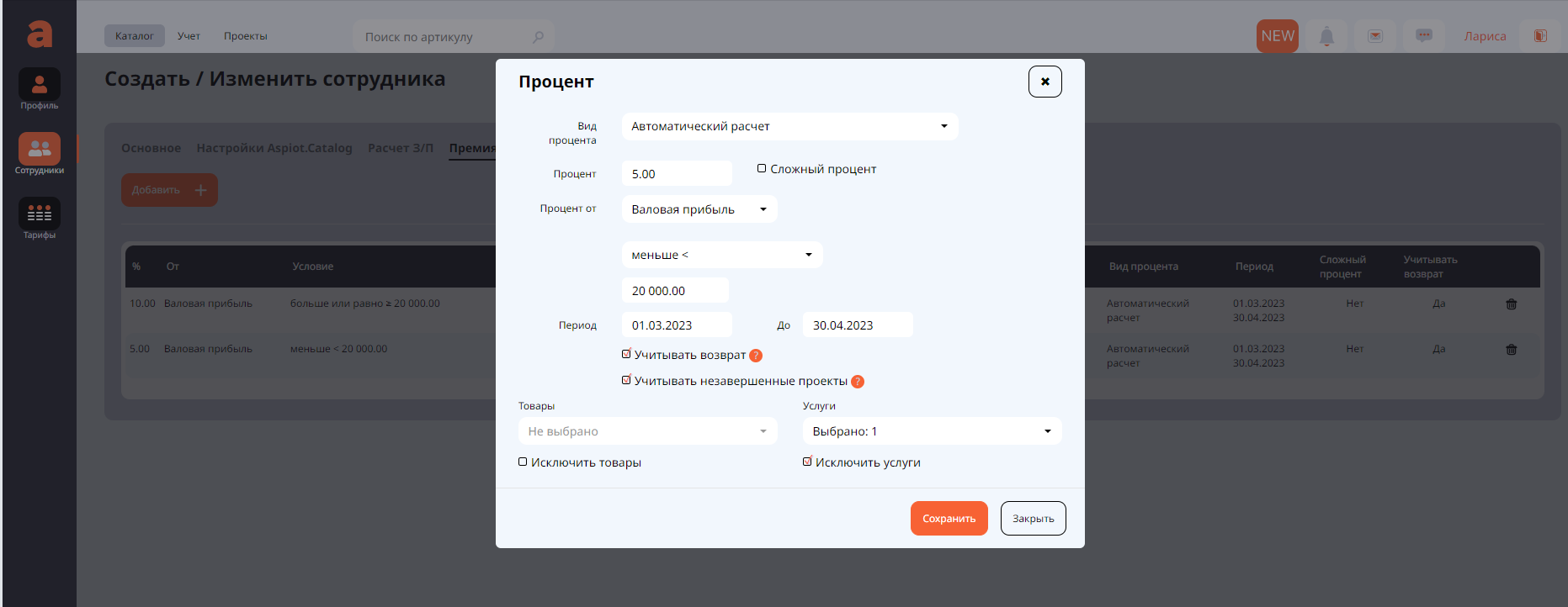 Устанавливаем период и ставим галочку, если хотим учитывать возврат и незавершенные проекты. Возможно определить товары и услуги, от продажи которых будет рассчитываться премия. Если вы хотите исключить из расчета определенные товары и услуги, вы должны установить галочку Исключить под выбранными товарами или услугами.