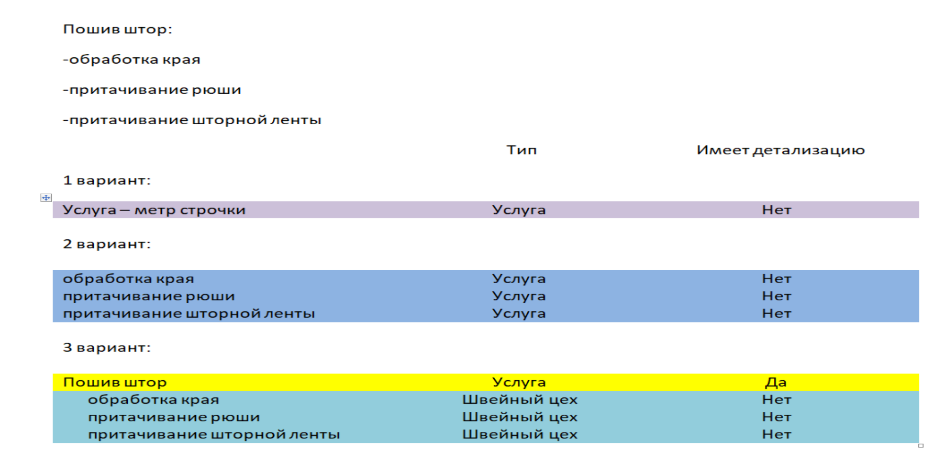 Допустим, что клиент просит вас пошить шторы, и эта условно называемая основная операция будет включать в себя другие операции - притачивание шторной ленты, обработка края, притачивание рюши.