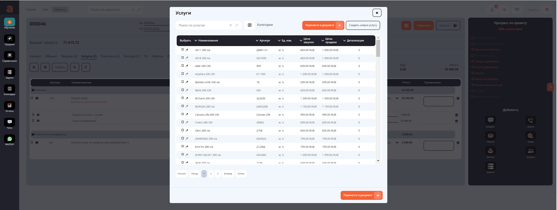 Нажимаем на это сообщение, и из справочника услуг подтягиваются только те услуги, в типе которых установлено - Швейных цех.
