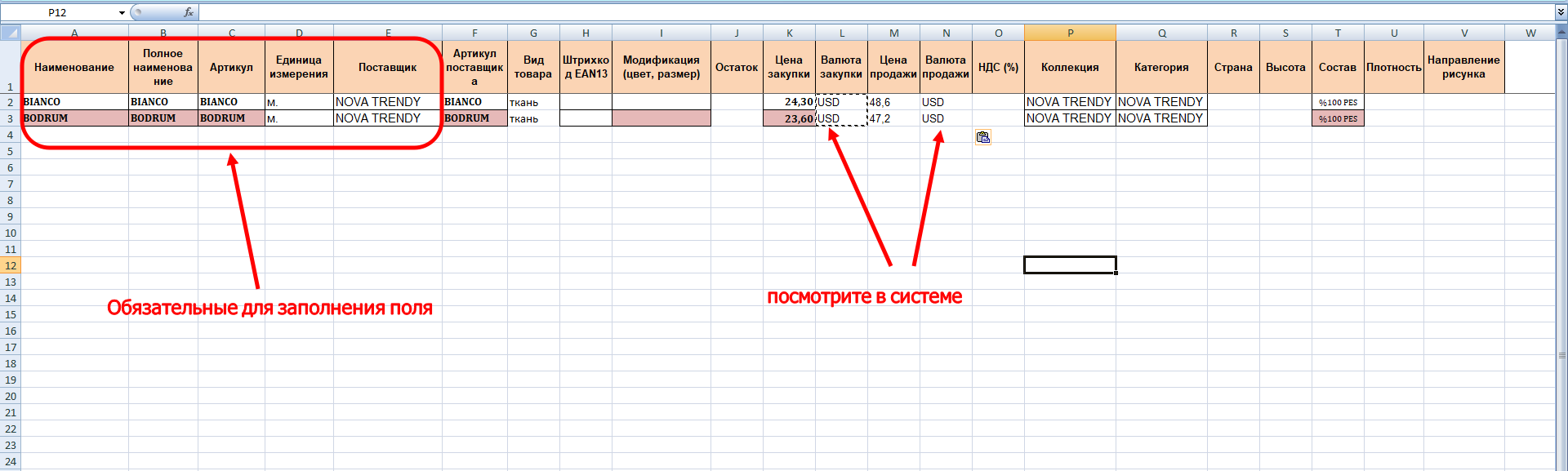 Шрих-код можно оставить пустым, программа сформирует его по правилам EAN13, но можете заполнить его, если уверены в правильности формирования. Чтобы понять какими значениями заполнить столбцы Вид товара, Коллекция, Категория, Валюта закупки и Валюта продажи необходимо посмотреть как эти поля заполняются в карточке товара в системе. Особенно это важно для полей Валюта закупки и Валюта продажи.