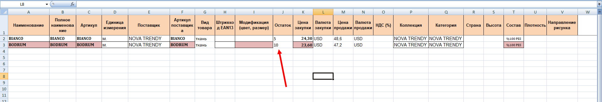 Если в вашем салоне на момент начала работы в программе есть остатки товара, то вы можете заполнить столбец остатки, в этом случае при загрузке шаблона сформируется документ Ввод начальных остатков товаров.