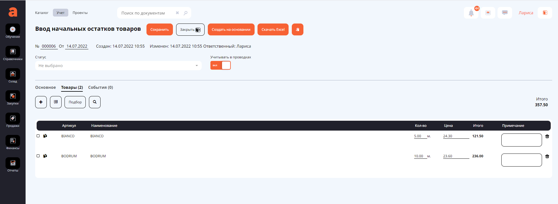 и документ Ввод начальных остатков товаров