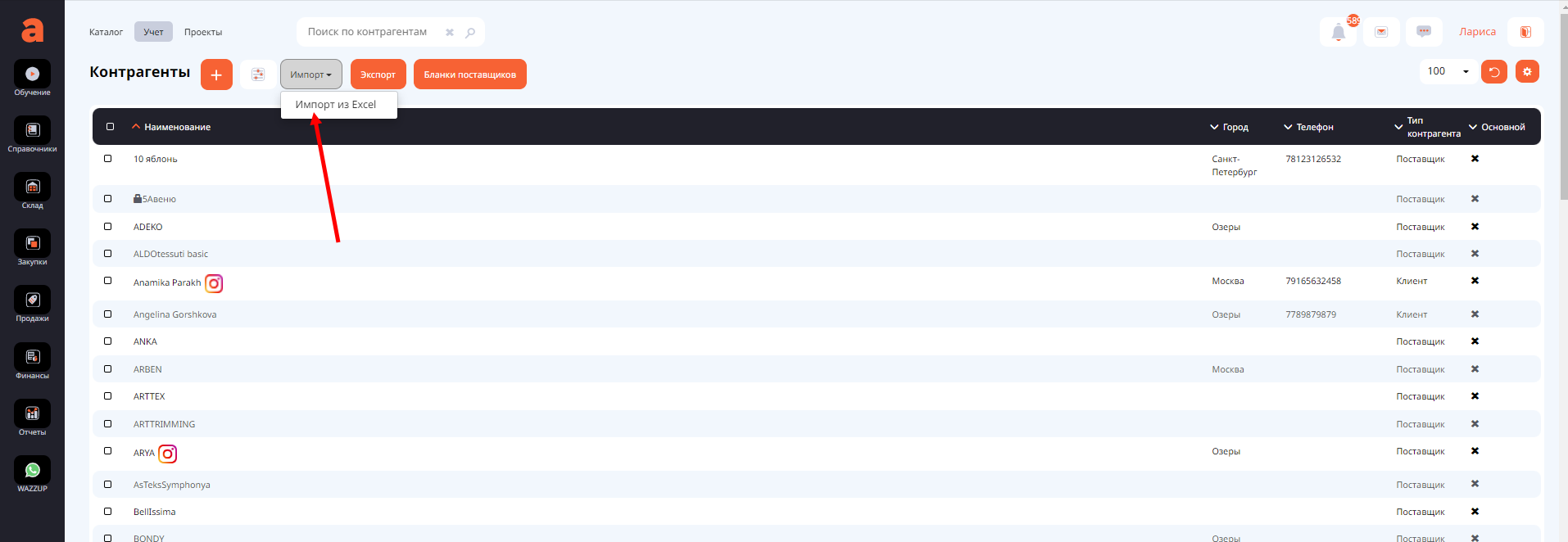 Самый быстрый способ заполнения справочника Клиенты/Контрагенты это импорт из файла MS Excel.