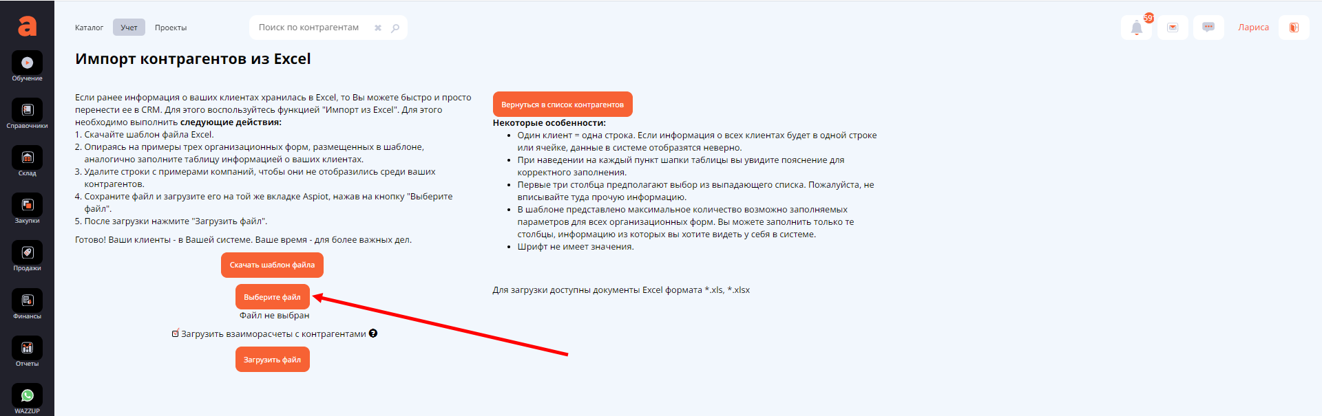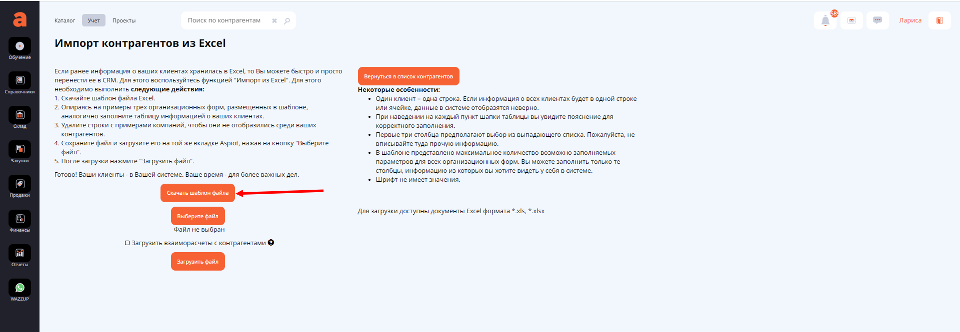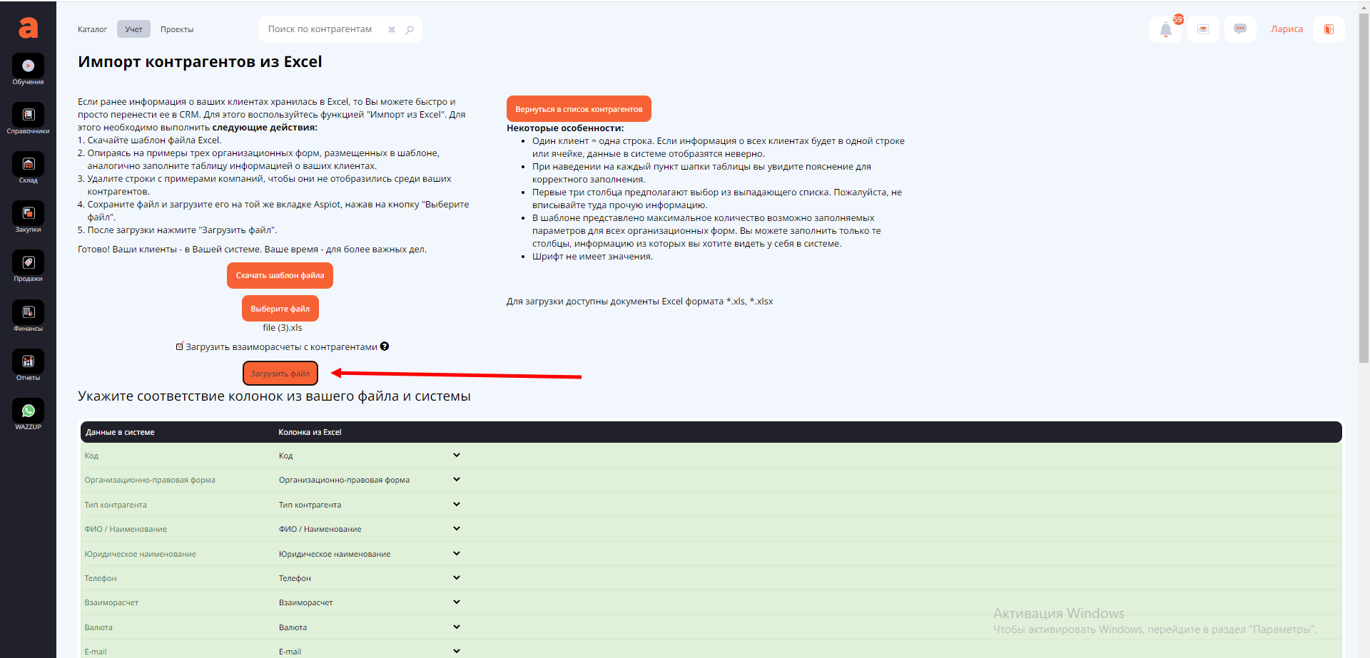 После внесения всей информации по контрагентам в шаблон, сохраняем его и загружаем в систему.