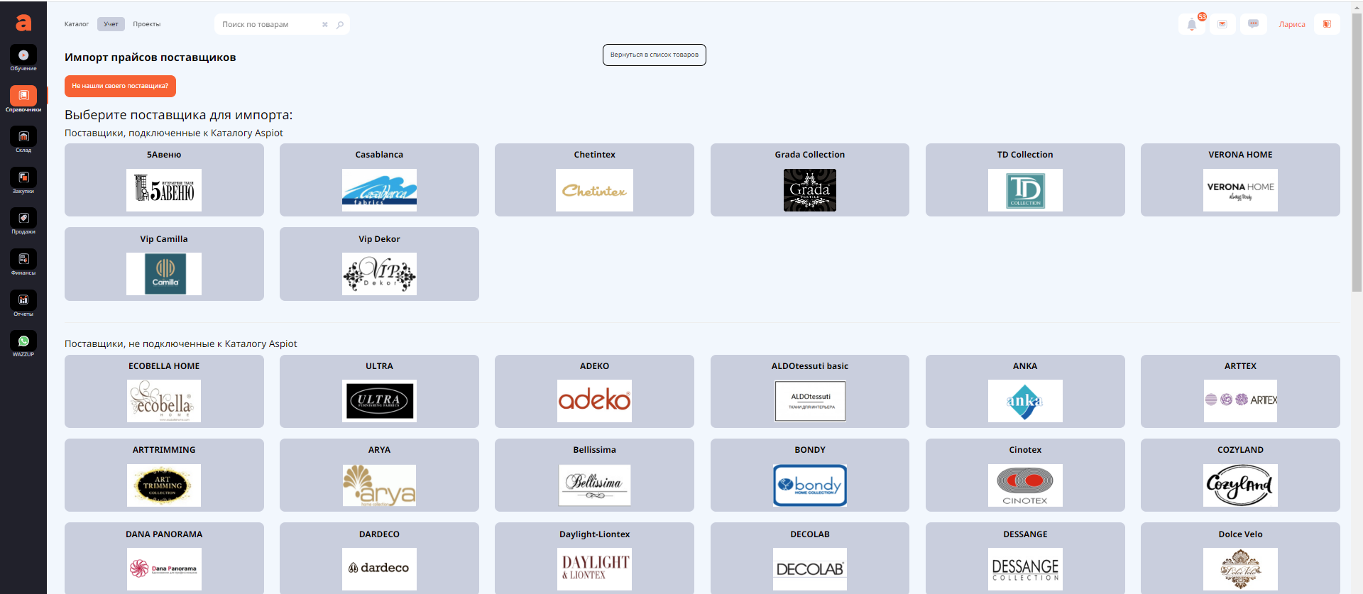 Разберем импорт из прайсов поставщиков. В верхней части страницы расположены кнопки поставщиков, которые сотрудничают с Аспиот. В нижней части страницы - прайсы поставщиков, не подключенных к Каталогу коллекций Аспиот. Но принципы загрузки прайсов для любых поставщиков на этой странице похожи.