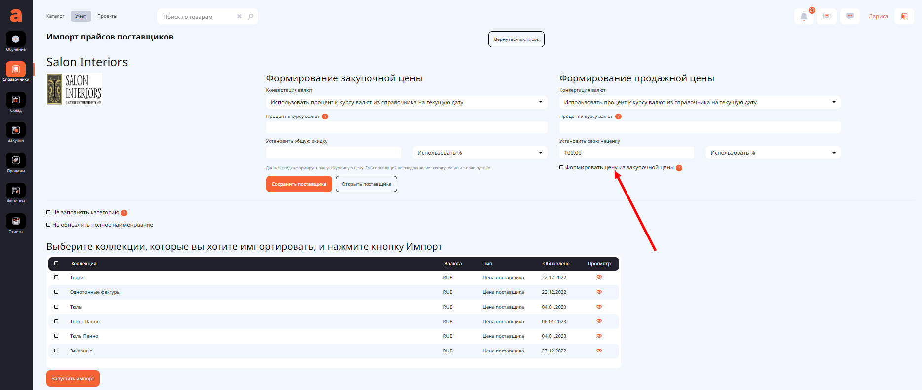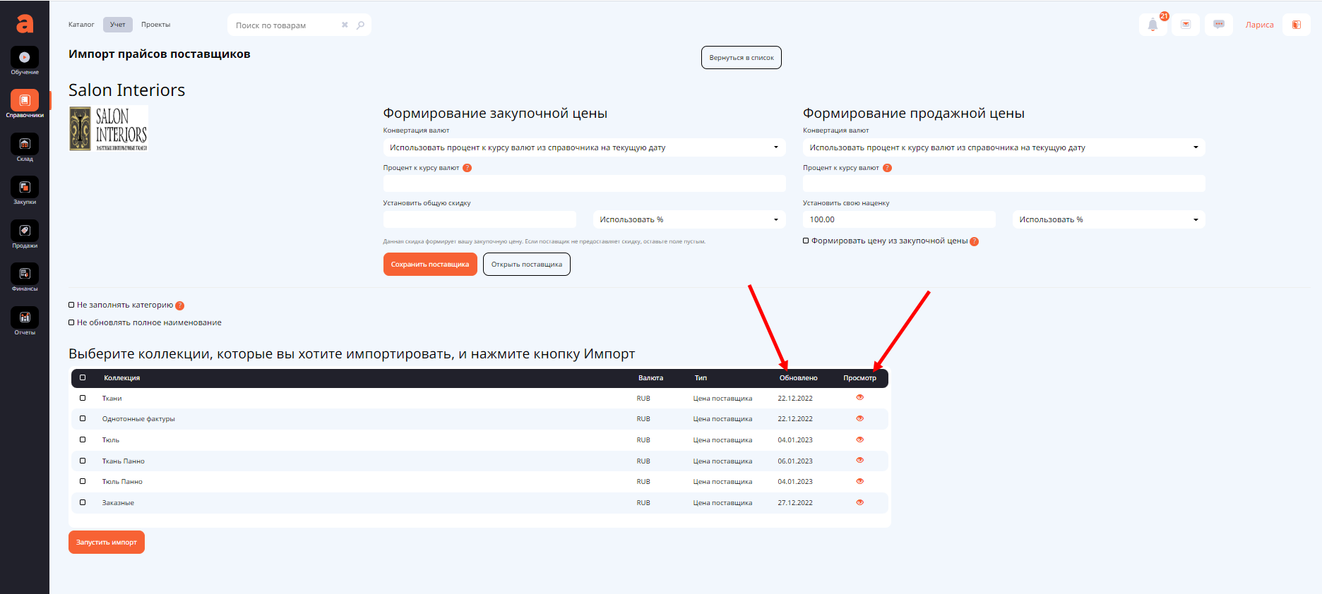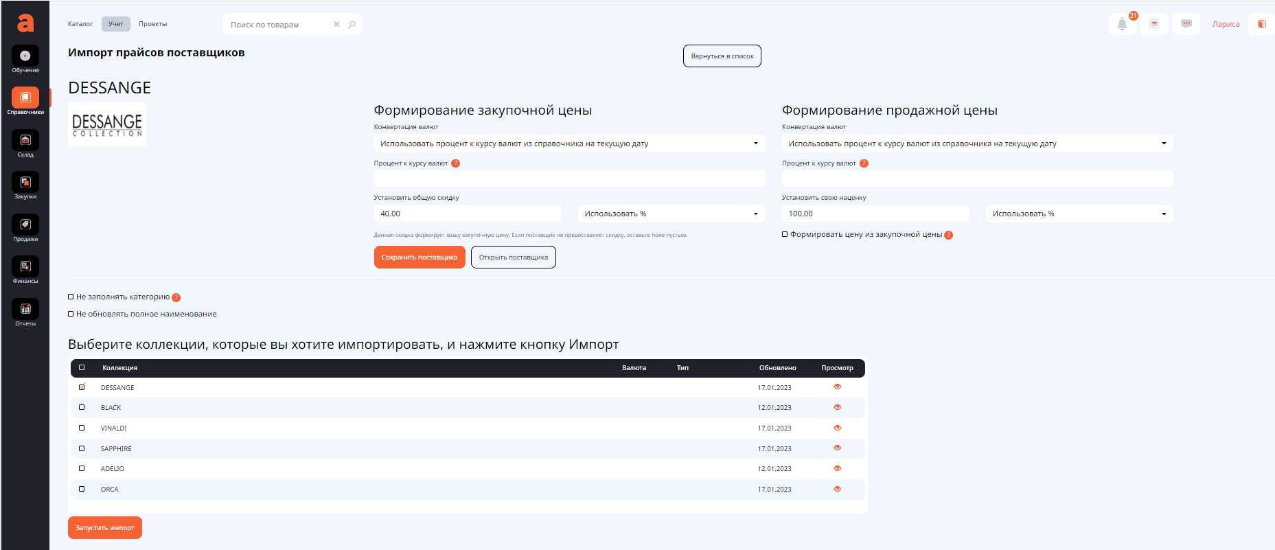 Если добавлять товар в проект по кнопке +, установленных настроек достаточно. В случае, если Вам необходимо предварительно импортировать в справочник товаров товары поставщика, отметьте галочками нужные коллекции и в нижней части страницы нажмите на кнопку Запустить импорт.