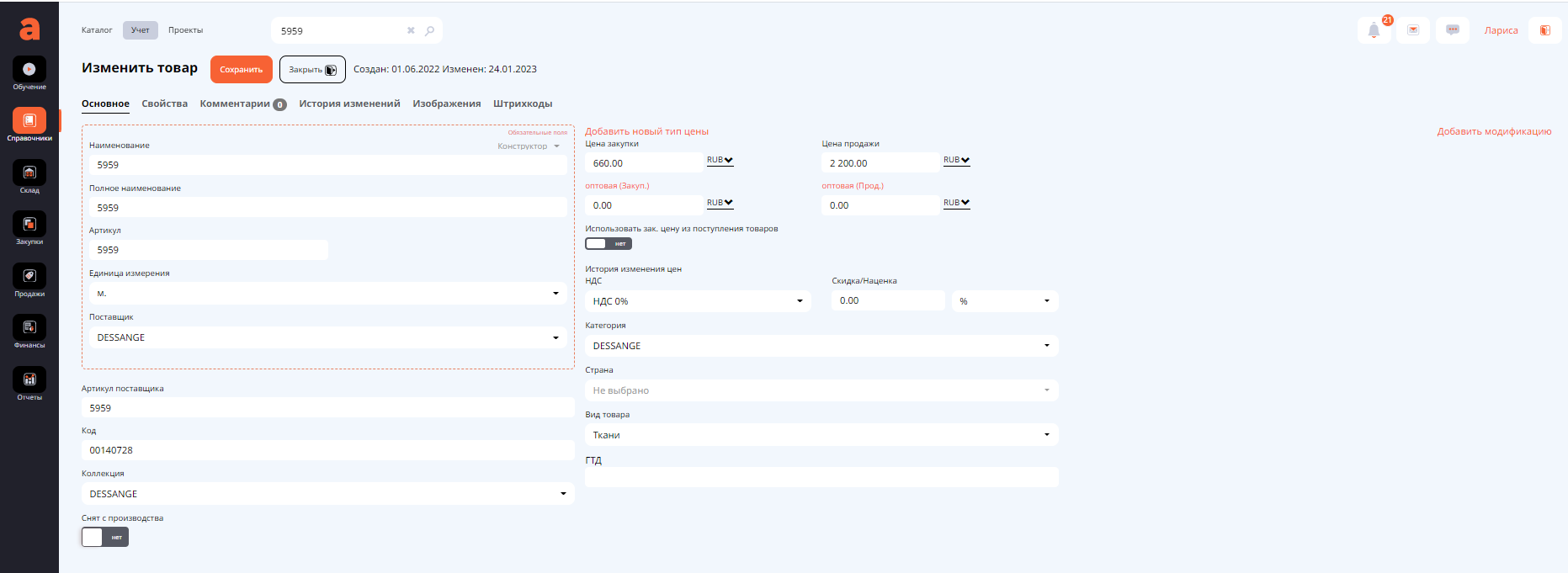 Если товар принадлежит поставщику, который сотрудничает с Аспиот, то наименование, артикул и закупочная цена будет недоступна для редактирования. Это сделано для того, чтобы вы могли из системы сделать заказ поставщику, и эти параметры товара должны совпадать у вас и у поставщика.