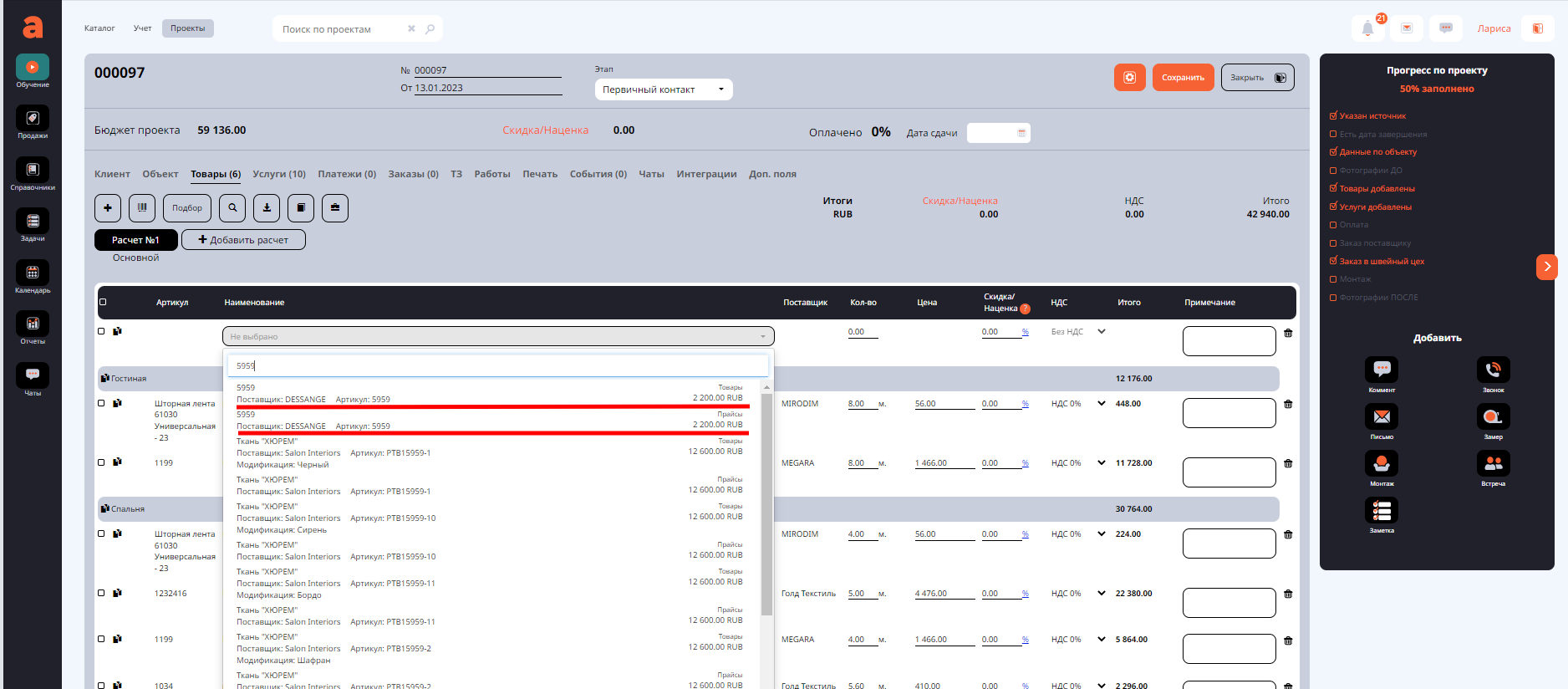 В проекте при добавлении товара по кнопке + артикула 5959 после загрузки прайса Вы увидите две строчке с указанным товаром - из справочника и их прайсов. В этом окне в строке Прайсы отображается продажная цена.
